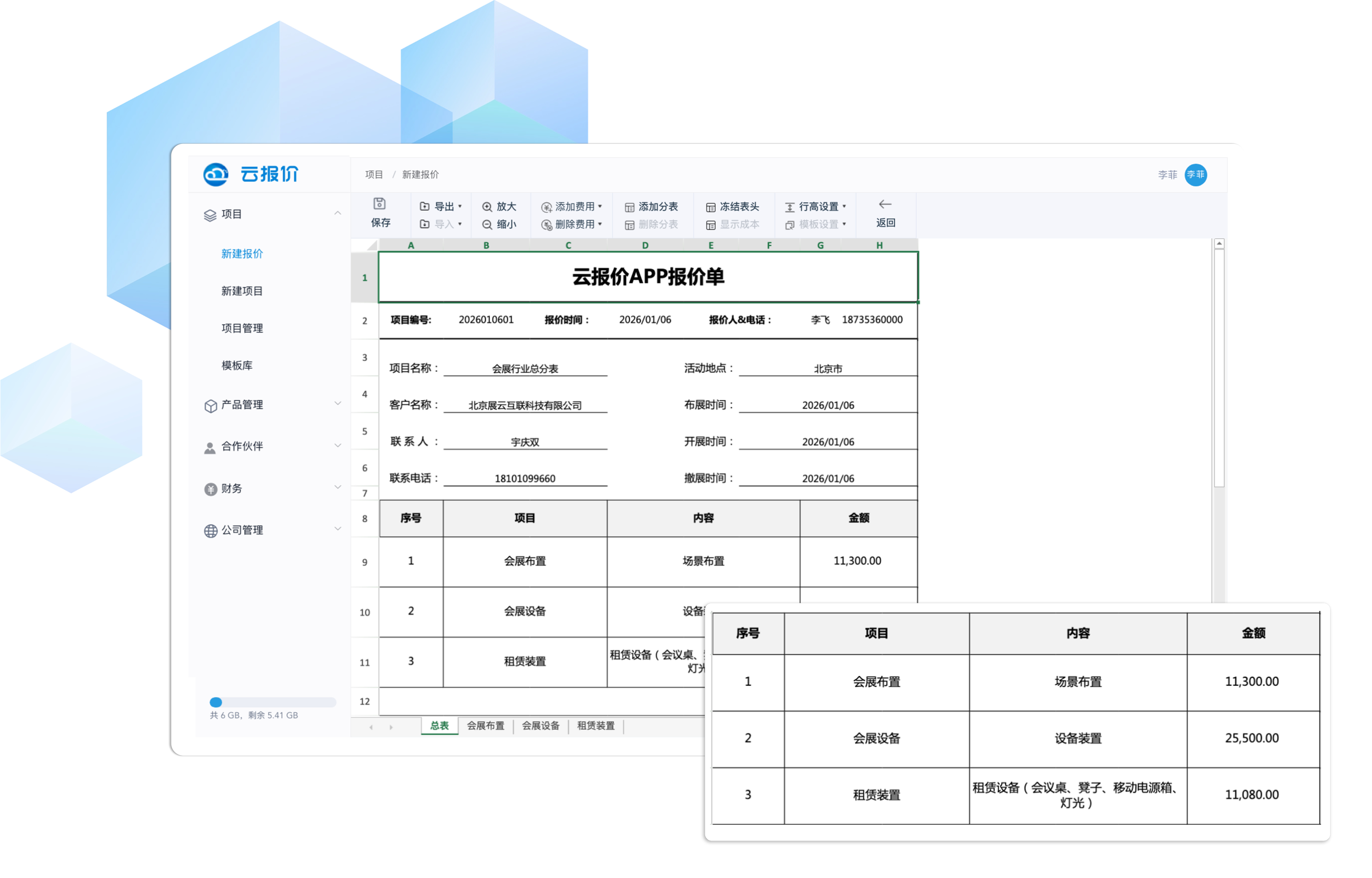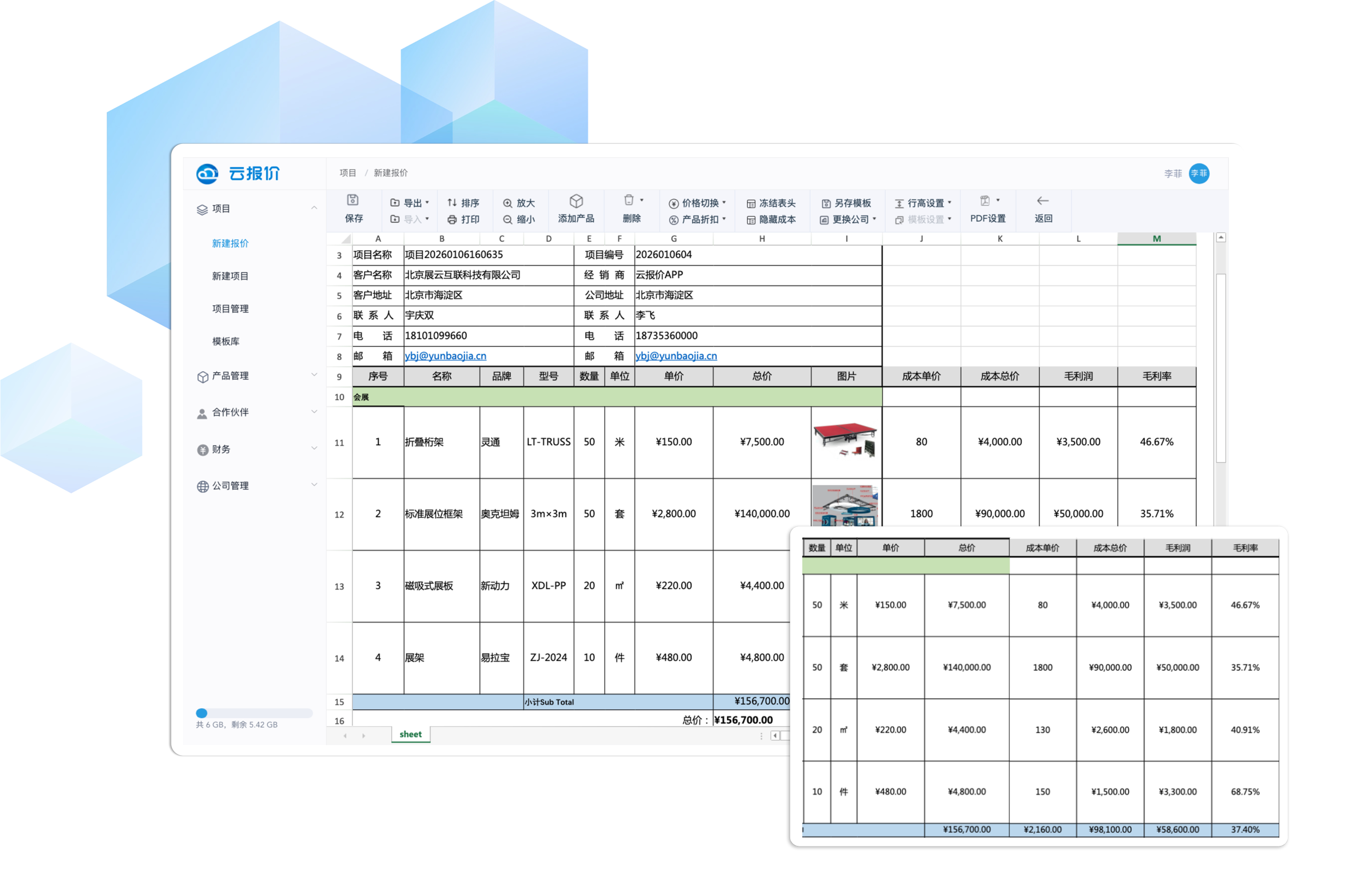 轻松制作带成本及利润的报价单,系统内嵌计算公式,无需人工计算即可直观显示成本总计、利润、利润率